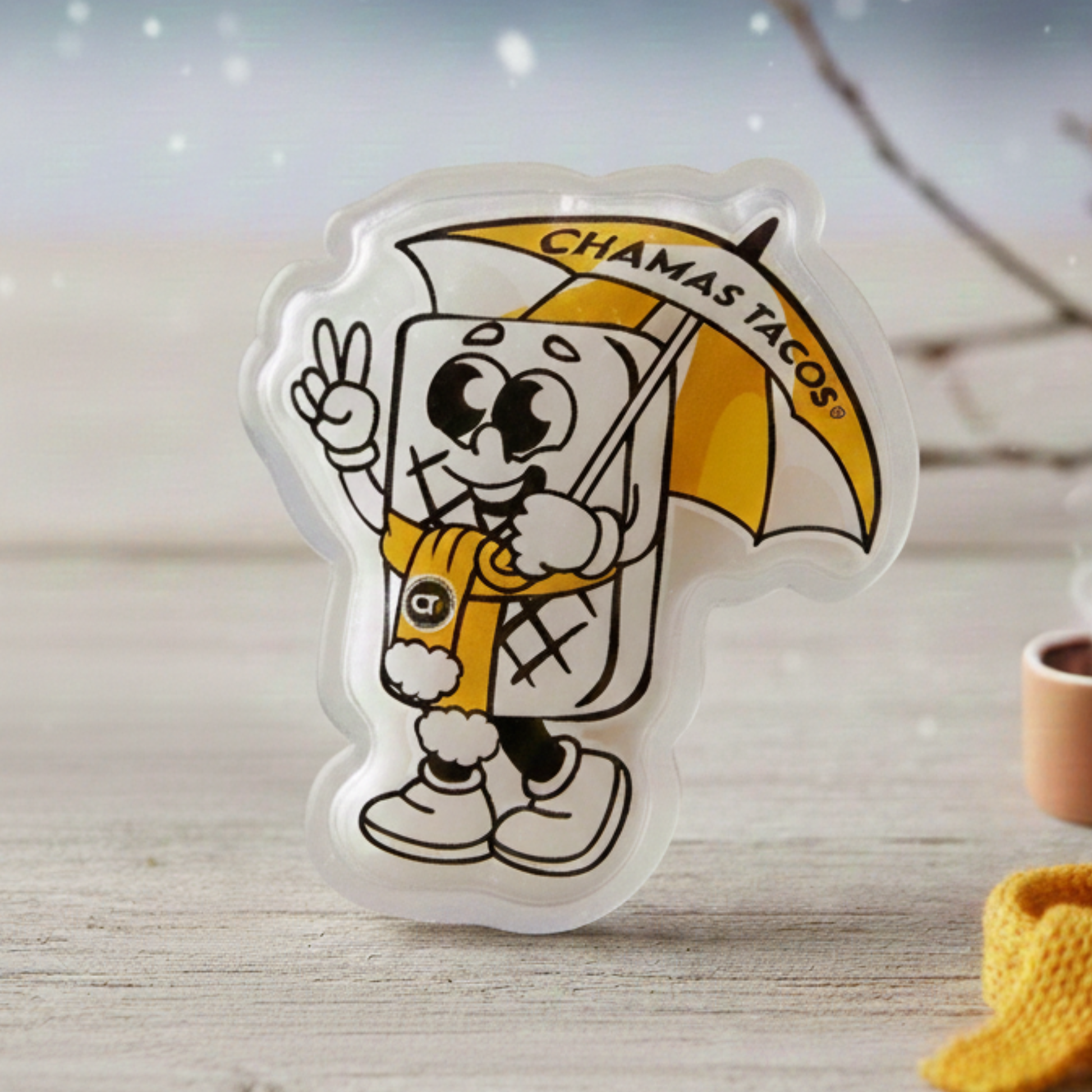 Chaufferettes à main CHAMAS TACOS pour garder les mains au chaud. Activation instantanée par pression sur la plaque métallique. Sans piles.
